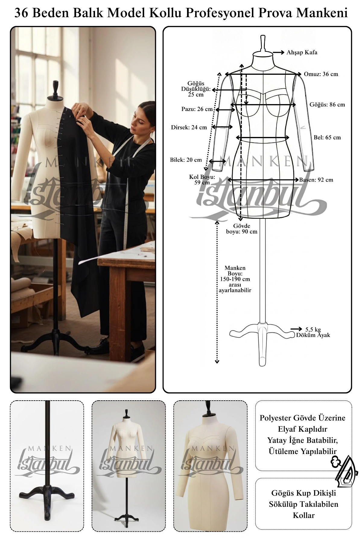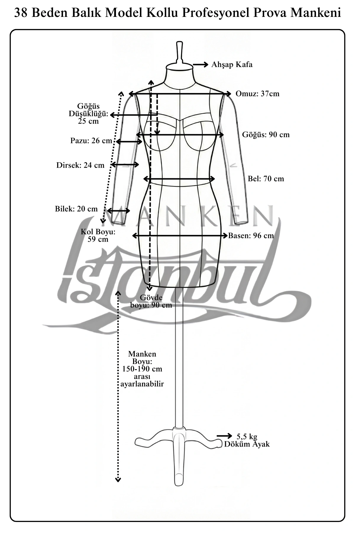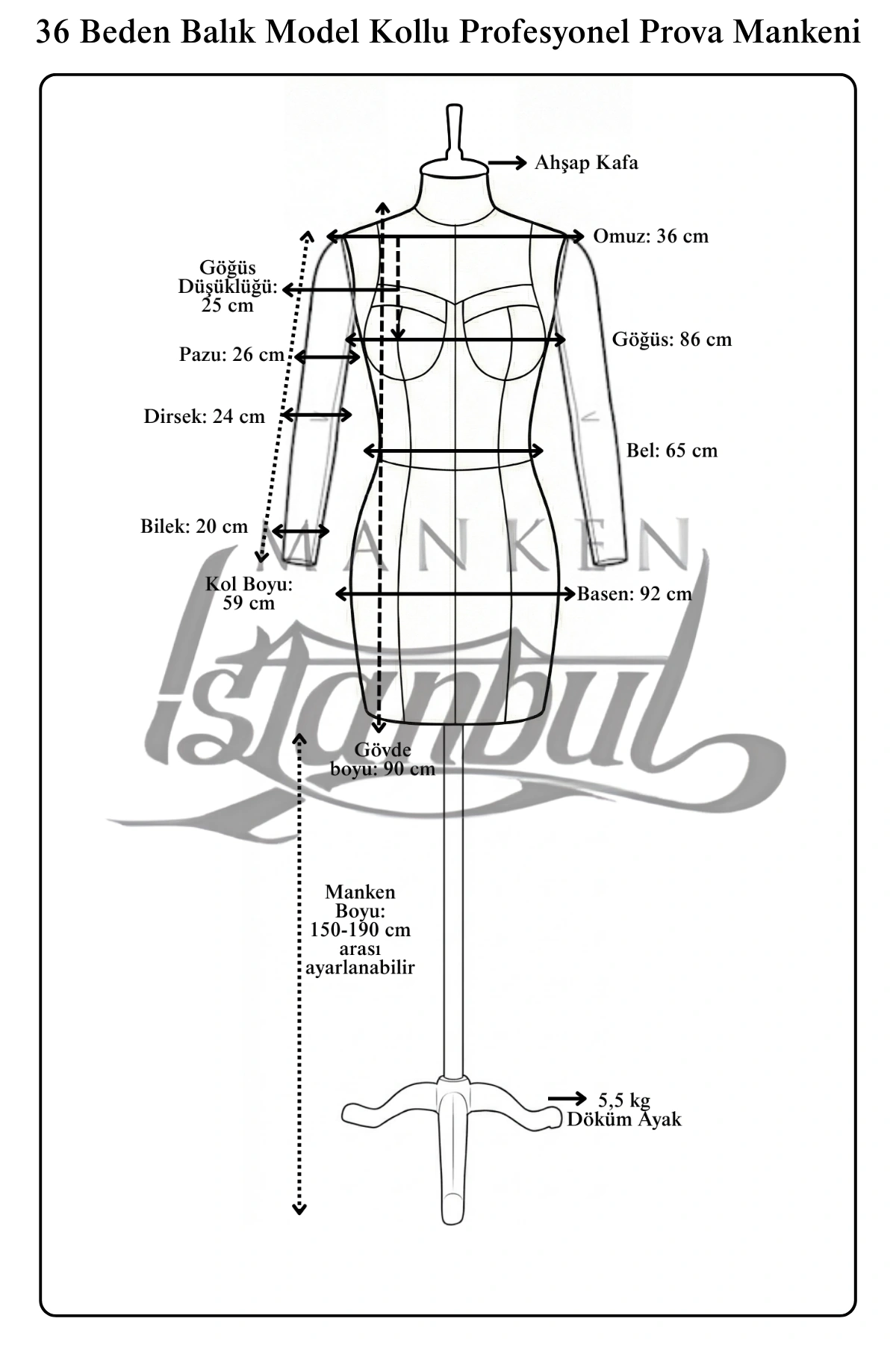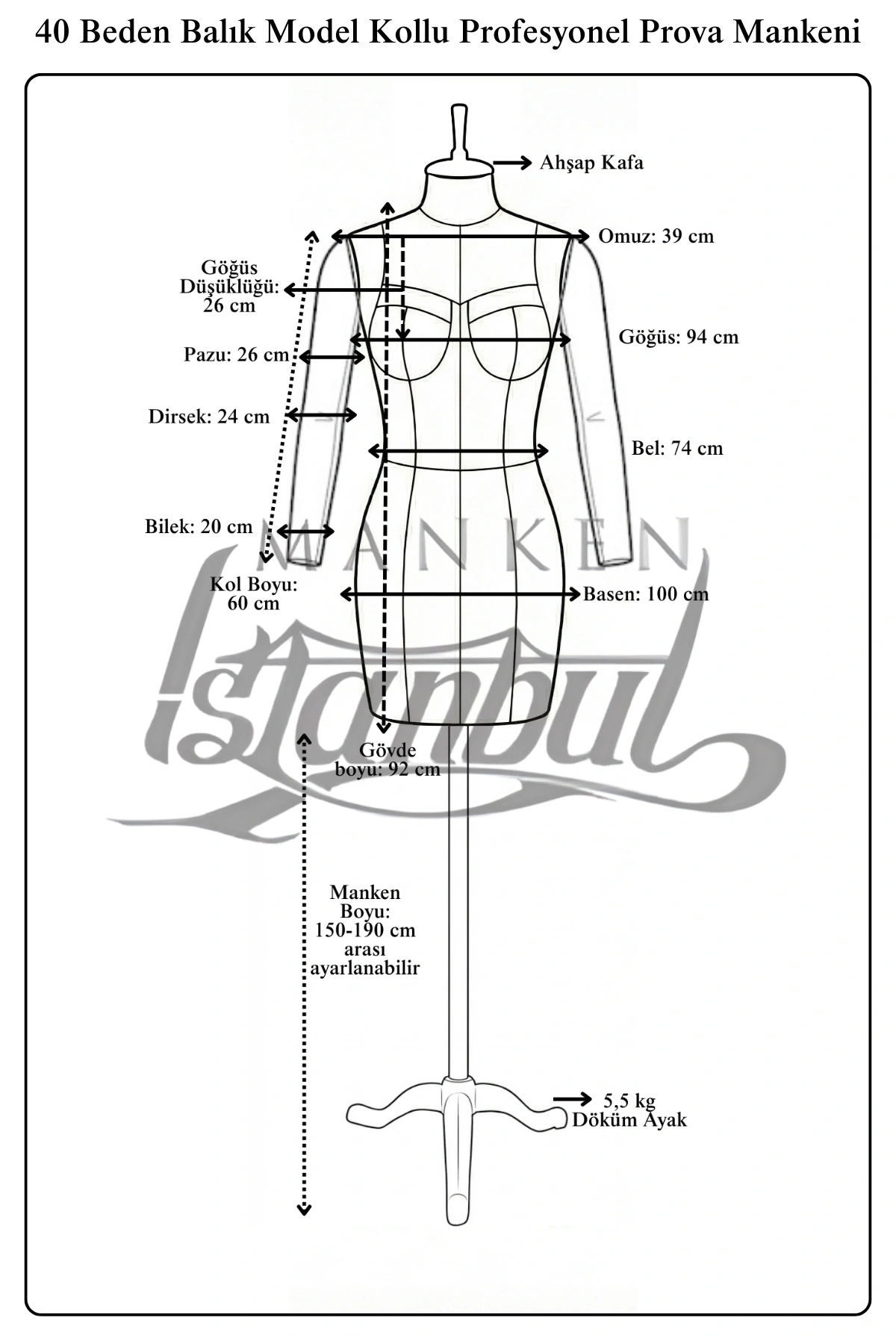 Bayan profesyonel kollu terzi mankeni, giysi üretimi ve prova için tasarlanmış özel bir ekipmandır. Gerçek insan vücut formunu baz alır. Bu sayede ölçü doğruluğu artar. Kollu yapısı, özellikle ceket, gömlek ve elbise çalışmaları için avantaj sağlar. Ayrıca omuz ve kol hatları net görünür.