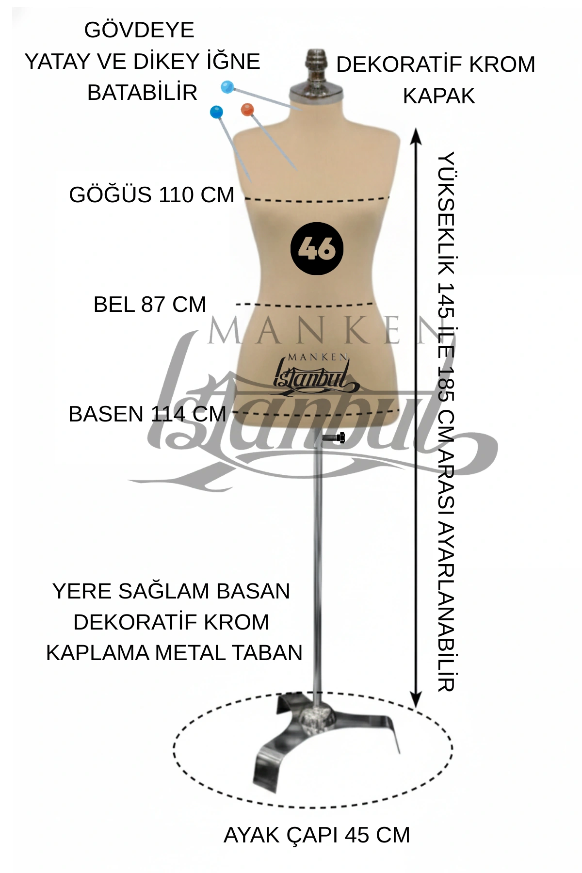 Kaliteli iç iskelet yapısı, mankenin formunu uzun süre korumasını sağlar. Devrilmeye karşı dirençlidir. Bu nedenle yoğun kullanıma uygundur. Uzun vadede bakım gerektirmez.