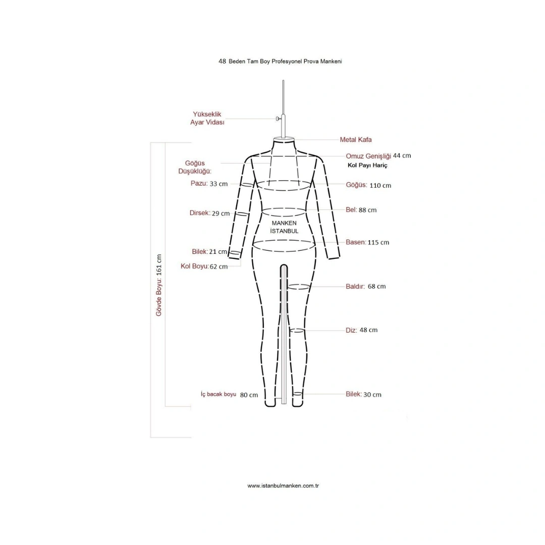 48 beden ölçülerine uygun tasarlanmıştır. Göğüs, bel ve basen oranları dengelidir. Böylece giysi üzerindeki duruş doğru analiz edilir.